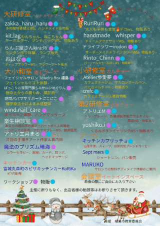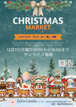 カルチャー、マルシェでお世話になった作家様や癒しブースを集めた「クリスマスマーケット」を開催します。多肉植物やパンチニードル、トルコランプのワークショップやキッチンカーなど楽しめます。皆様のご来場、お待ちしてます。ワークショップご予約はメール cococorolla518@gmail.comまで。