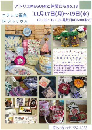 ポーセラーツと切り絵、あみぐるみ、編物、和紙折紙、布や押花の小物を展示(一部販売)。ポーセラーツと切り絵のワークショップもあります。